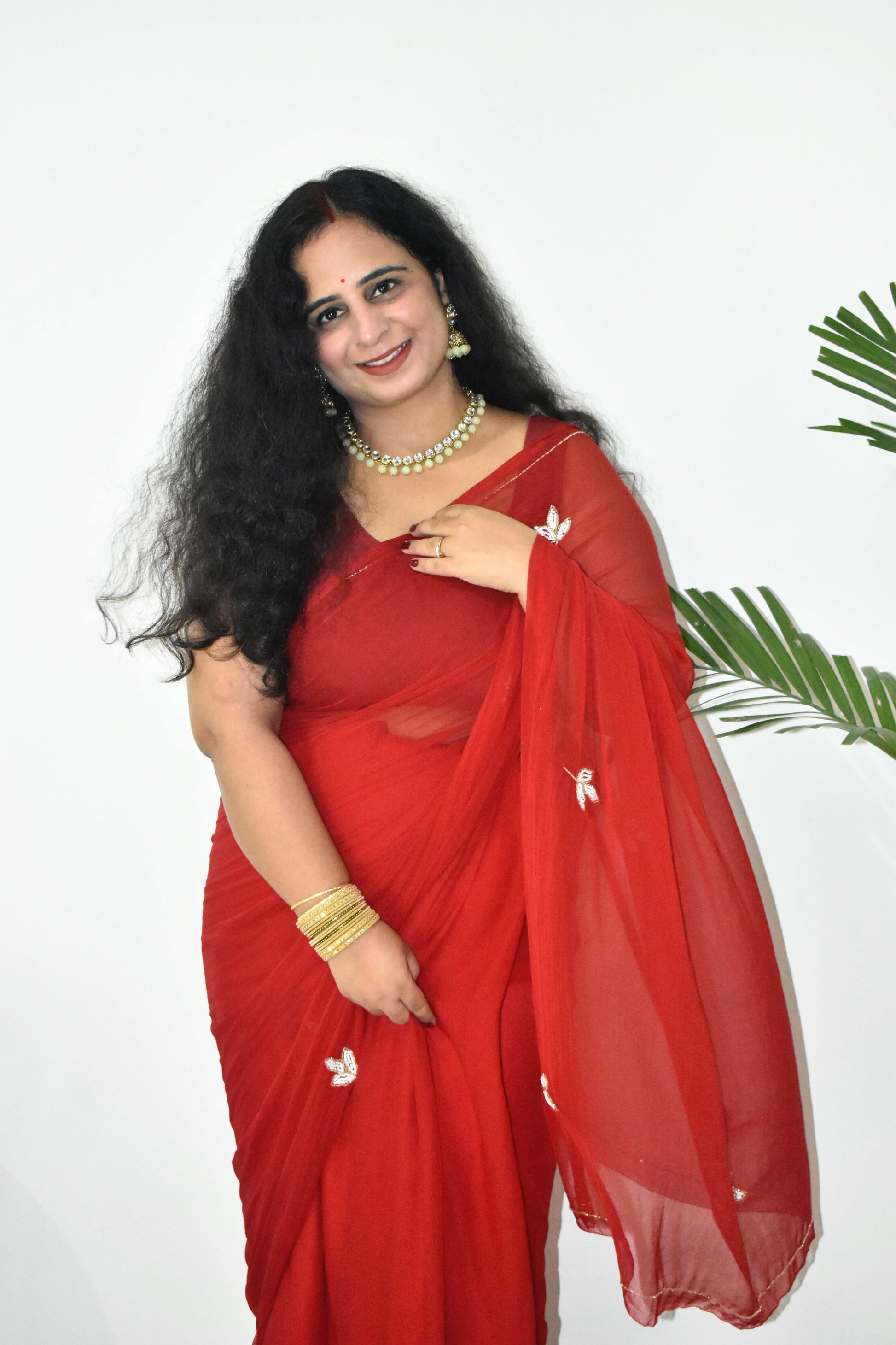 Embrace the magic of celebration with this red chiffon saree, expertly embellished with hand-worked buttis that shimmer unassumingly — perfect for the moments you’ll remember. Crafted in lightweight chiffon fabric, this saree ensures you stay comfortable throughout your long Karwa Chauth rituals, yet look effortlessly radiant when the moon rises.